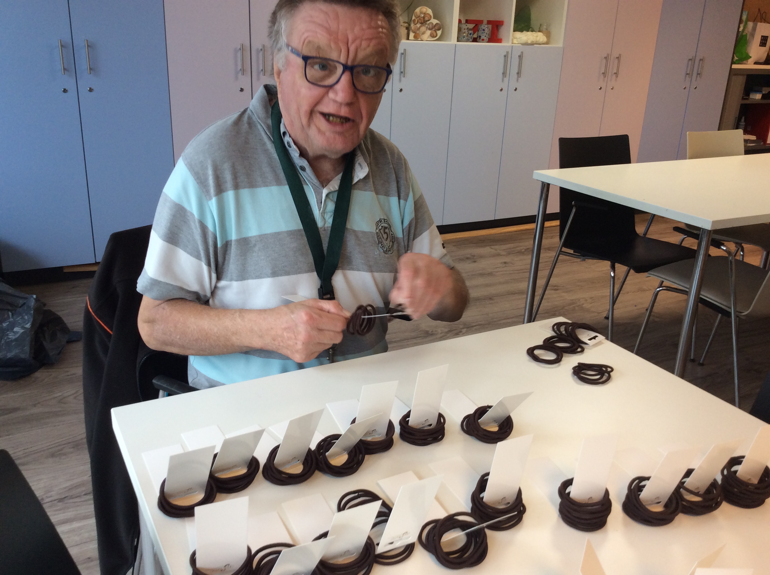 In groep 1 kun je flink aan de slag. We doen hier allerlei kleine klusjes zoals elastiek om kaartjes doen en doosjes vouwen.